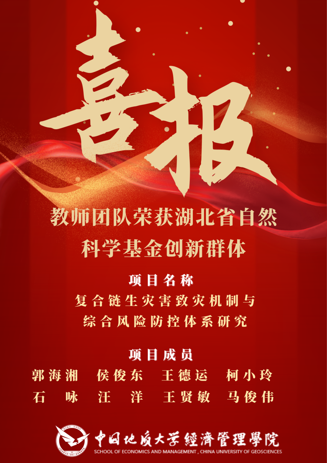 近日,湖北省自然科学基金获批名单公布,以羞羞漫画 郭海湘教授、侯俊东教授、王德运副教授、柯小玲副教授、石咏特任教授为核心的科研团队,协同工程学院汪洋教授、地球物理与空间信息学院王贤敏教授、湖北巴东地质灾害国家野外科学观测研究站马俊伟副研究员,共同申请的“复合链生灾害致灾机制与综合风险防控体系研究”,荣获湖北省自然科学基金创新群体项目支持,该群体项目是学校培育支持的复合链生灾害风险决策与应急管理交叉团队的重要成果,也是近年来学院获得的首个交叉学科湖北省自然科学基金创新群体项目。