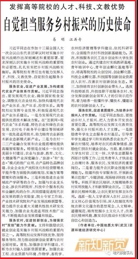 青年教师易明和汪再奇在《人民日报》理论版发表文章《自觉担当服务乡村振兴的历史使命》。全文如下: