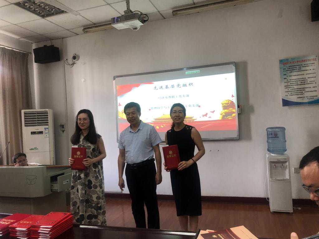 丁丽萍、朱冬元分别代表管理科学与工程系、经济系党支部做工作总结,从支部建设、人才梯队建设及学生工作等方面分享了本支部工作重点和特色;获奖党员代表王广民、田昆、李江敏、梁玥琳、朱冬元、江毅、徐德义等先后发言,他们结合各人工作实际,谈了共产党员的初心和使命。党委副书记沈波高度肯定了各位同志的工作成绩,他强调,党员应是教师队伍中的先进分子,开展“三全育人”离不开教职工党员的共同努力。