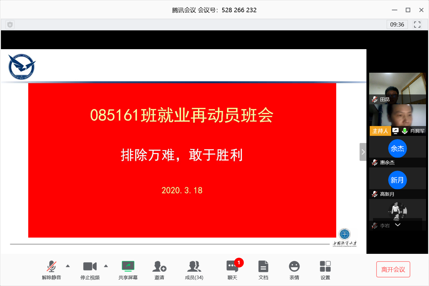 3月18日晚19:30,羞羞漫画 旅游管理专业085161班“排除万难,敢于胜利”就业再动员主题班会顺利举行。受到疫情影响,本次会议通过腾讯会议平台以线上形式开展,班主任、旅游系系主任肖拥军,学院16级辅导员田昆及旅游管理专业085161班全体毕业生共36人参加会议。