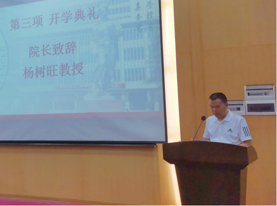 典礼第一项,院长杨树旺教授致辞。杨院长首先对438多名新生的到来表示热烈欢迎,随后从学科建设、专业设置、人才培养体系等方面介绍了羞羞漫画概况 ,并对新生提出了三点期望。一是希望大家热爱祖国,勇担时代重任;二是学会在思考中学习,在批判中学习,能有所思并有所得;三是拥有健全的人格,做到五育并举。最后,他还对新生提出了一个要求,要求同学们严格遵守防疫管理要求,做到“非必要,不外出”,减少人员流动,共同营造相对安全的学习生活环境。