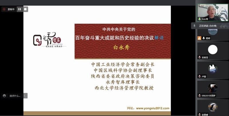 (通讯员 王彦闻)12月2日,应学院金贸系易明教授邀请,中国工业经济学会常务副会长、中国区域科学协会副理事长、陕西省委省政府决策咨询委员、西北大学羞羞漫画 白永秀教授做客经管论坛并通过网络会议的方式,为羞羞漫画 师生献上了一场精彩的学术报告,论坛主题为党的十九届六中全会解读。