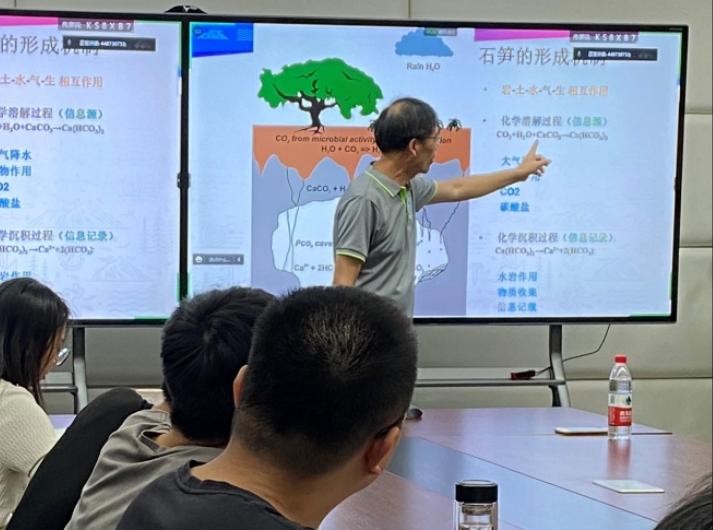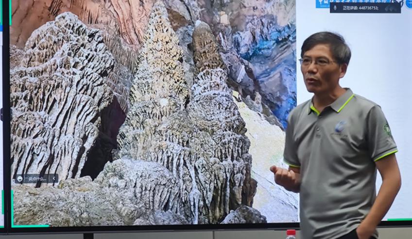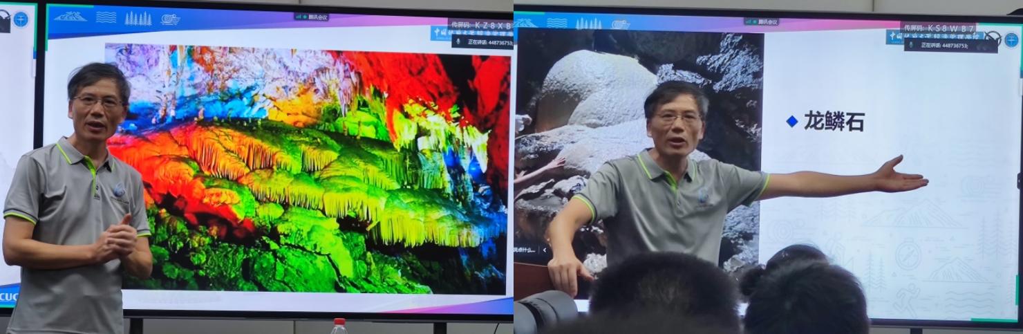 在两个半小时的讲座和座谈分享中,胡教授结合通山隐水洞地质公园内的钟乳石及其他典型岩溶景区的照片,不仅为实习师生在实习中观察到的景观细节答疑解惑,而且结合自身及国内外科学家对溶洞及石笋等溶洞沉积物的科学研究,为师生解译记录在溶洞景观中的气侯环境变化信息,揭示深藏在溶洞里的自然奥秘。