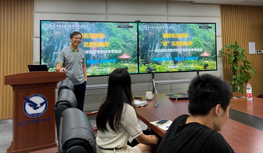 (通讯员 周玲 摄影 陈豪 周玲 )2022年8月25日晚18:30,受实习带队教师周玲老师的邀请,知名溶洞沉积物与全球变化研究专家胡超涌教授做客2022暑期旅游教学实习课堂,在未来城校区科七楼422会议室,为参与通山隐水洞地质公园实习考察的全体旅游师生开展了以“解译岩溶地貌景观,‘洞’见地学旅游”为主题的讲座和座谈活动。此次活动为旅游管理系“知名专家进课堂”系列活动之一,暑期旅游实习班级085201班全体同学和实习带队教师周玲、代姗姗、刘晶晶参加活动。