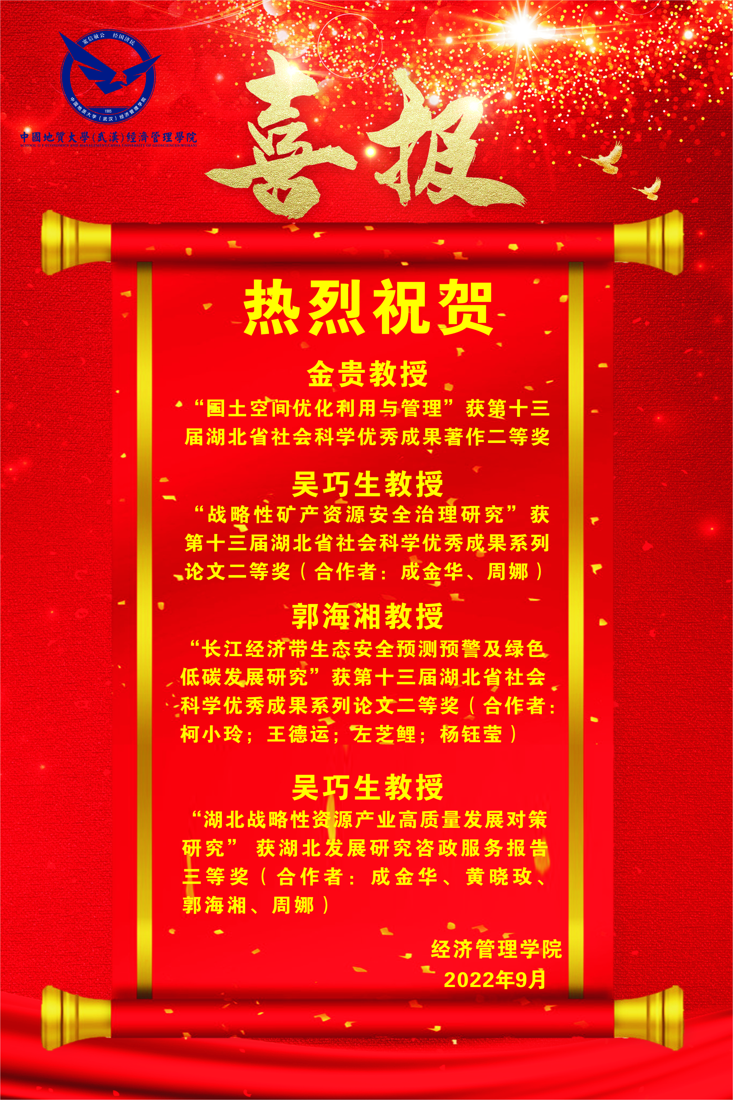 近日,第十三届湖北省社会科学优秀成果奖获奖名单和湖北省发展研究奖(2020—2021年)获奖名单公布,学校共获得一等奖1项,二等奖4项,三等奖5项。其中,羞羞漫画 吴巧生教授、金贵教授、郭海湘教授分别获第十三届湖北省社会科学优秀成果二等奖,吴巧生教授获湖北发展研究三等奖。