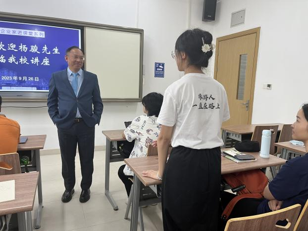 (通讯员 李会琴)为深入贯彻教育部关于新文科建设的会议精神,推动校企合作,提升学生产业认知,促进《现代酒店管理》课堂教学改革,2023年9月26日下午,旅游管理系在未来城校区公教楼119教室举行了“优秀企业家进课堂”活动。本次活动邀请的嘉宾是万豪国际酒店集团华中地区总经理杨骏先生,杨经理拥有30余年的国际酒店管理经验,历任酒店财务总监、人力资源总监、市场营销总监、副总经理及总经理等职务,现致力于国际酒店集团与院校的校企合作及人才培养。