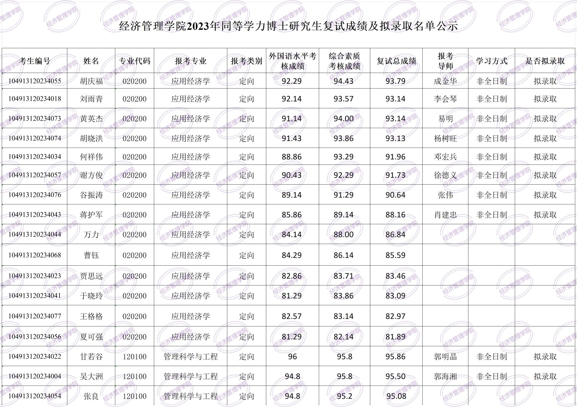 根据2023年同等学力人员申请博士学位研究生招生复试录取工作方案,经资格审查和复试考核,现对2023年拟录取单证博士生名单予以公示,公示期为6月12日-6月21日。在公示期内有异议的,请联系经管学院研究生办公室王老师,联系方式:027-67883204,邮箱:[email protected]。