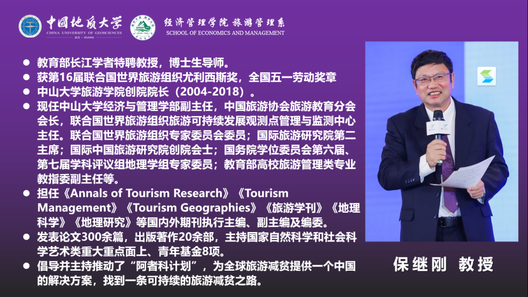 保继刚教授在旅游学术研究、旅游教育和旅游社会服务各方面均有杰出贡献,是教育部长江学者、第16届联合国世界旅游组织尤利西斯奖获得者、全国五一劳动奖章获得者。讲座以《“阿者科计划”的实践与理论》为题,详解保继刚教授团队在云南红河哈尼梯田世界文化遗产核心区的阿者科村开展的遗产保育与旅游可持续发展培育计划,解析计划创设、实施、运作实践背后关联的发展中国家的旅游发展模式、乡村旅游经济发展、旅游与遗产保护、旅游重塑文化认同、村办集体旅游企业管理等旅游理论和学术研究问题,详解旅游减贫中的中国实践和中国方案背后的学术研究。