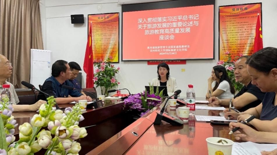 5月24日-26日,全国旅游院校院长、系主任和学科带头人联席会议在贵州师范大学召开。会议期间,教育部旅游管理专业国家虚拟教研室会同贵州师范大学国际文化旅游学院举办深入贯彻落实习近平总书记关于旅游发展的重要论述与旅游教育高质量发展座谈会。会上,旅游管理系李江敏教授作为全国党建工作样板支部书记,就旅游强国背景下的旅游高等教育创新发展和高素质旅游人才培养中的党建引领作用作了交流发言。