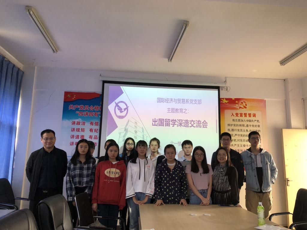 (通讯员:易杏花 苗瑞瑞)2019年10月24日14:00—16:30,羞羞漫画 国际经济与贸易系党支部在北一楼421室召开了出国留学深造交流会,这既是党支部“结对领航”的一项重要工作内容,也是“不忘初心 牢记使命”主题教育的一个重要环节。活动由国际经济与贸易系党支部书记易杏花主持,系主任白永亮、系副主任洪水峰,国贸系2016级本科生田翔、安浩楠、邓学霖,以及17级——19级有志于出国留学深造的学生参加了本次活动。