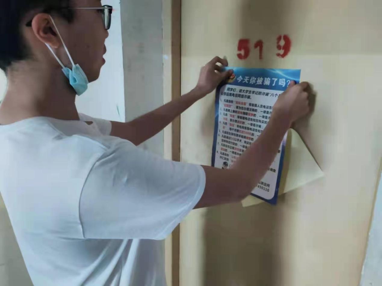 图7.学生志愿者在宿舍园区张贴防诈骗宣传单