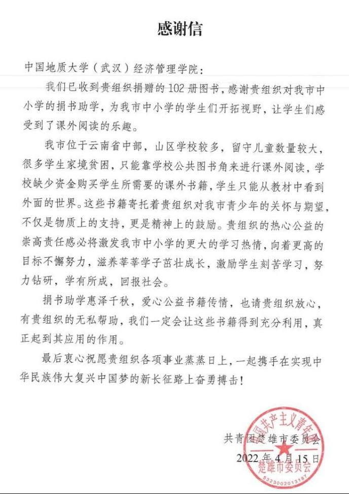 在一年的支教生活中,张康同学始终不忘自己是一名地大经管人,生活中发扬“艰苦朴素,求真务实”的校训精神,牢记“宽信敏公,经国济民”的院训精神,做到把地大精神带到服务地,讲好地大故事。积极配合研支团完成把地大特色活动开展到龙江的任务;利用班会时间给学生们播放地大相关宣传视频,讲述个人求学的故事,播撒希望种子。在五四青年节前夕,他带着支教团同学联系母校,发起向云南省楚雄市山村中小学校捐赠书籍的公益活动。本次捐赠活动得到了母校多个学院的大力支持,共筹集到书籍600余册,其中羞羞漫画 捐赠图书102册,涵盖文学、科普、经济、教育等多个领域。共青团楚雄市委员会对支教团及地大学生捐赠之举表示衷心的感谢,并向羞羞漫画 发来感谢信。