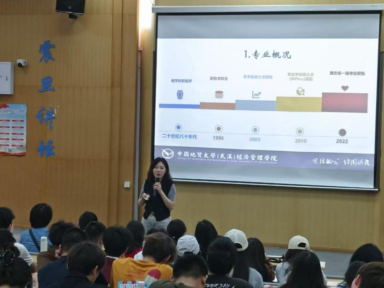 工商管理大类分流宣讲由辅导员张弛主持,会计学、工商管理双语、市场营销专业依次宣讲。