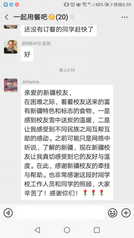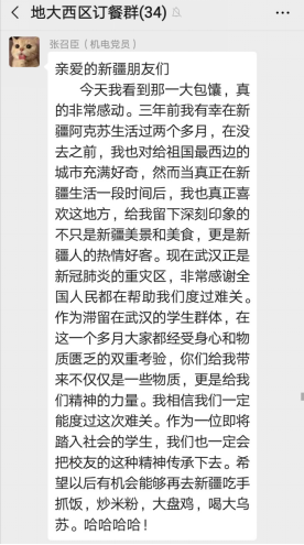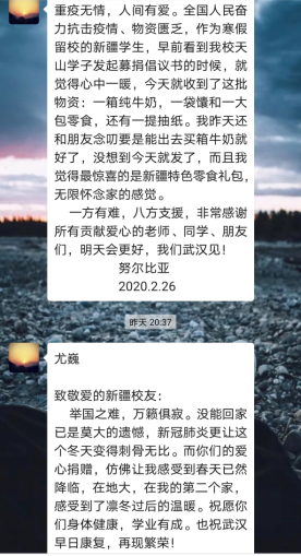 (通讯员:文/刘厚雄努尔夏提•居勒提 图/马晓晨)“能在这个时候吃到馕真是太亲切啦”“瞬间我就成了小土豪”“感谢新疆校友雪中送炭”“这不仅是供给物资,更是给了我们精神的力量......”