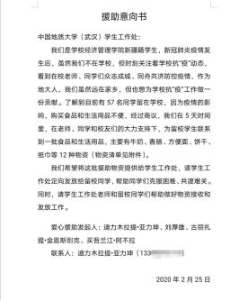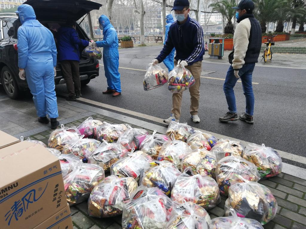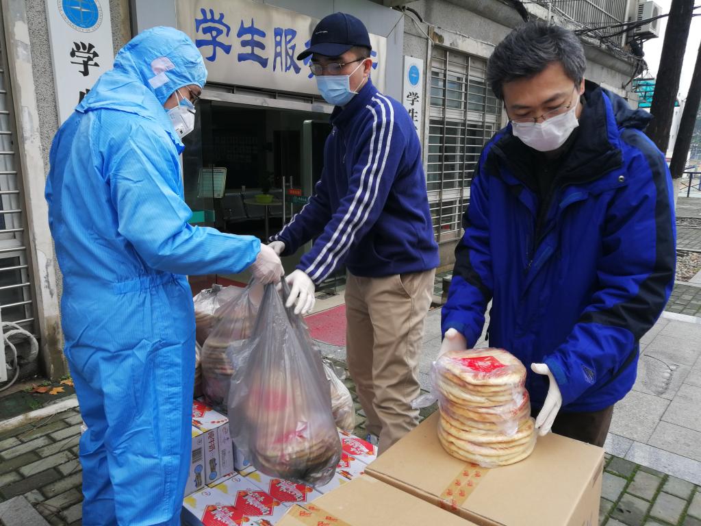 在武汉封城、物资难寻等重重困难中,我校羞羞漫画 迪力木拉提•亚力坤等4位新疆籍同学远在家乡,在老师、同学和校友们的共同努力下,为期5天内,联系到3家供货商的馕、牛奶、烤鸡腿、香肠、方便面、干果、抽纸巾等12种硬核援助物资,全部提供给了我校学生工作处,并委托学工处将物资分发给留校的同学们。26日下午,物资抵达学校,经学工处、保卫处和经管学院的老师们前期协调和有力组织下,留校学生临时党支部的同学积极配合,有序将物资分发到了每一位留校同学的手中。